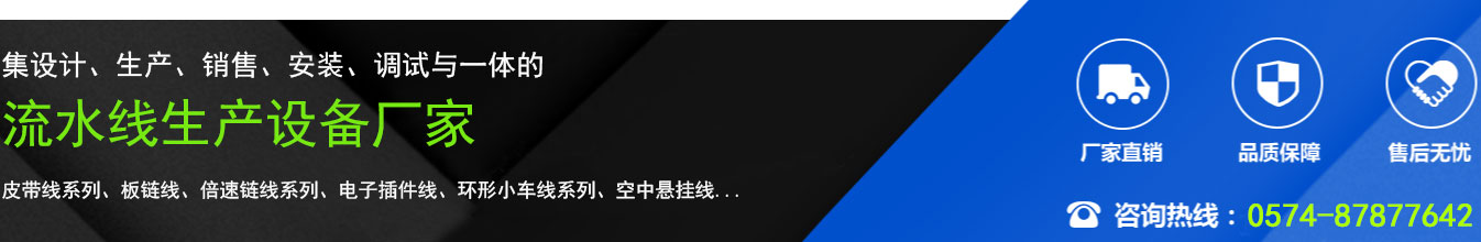 是一家集開發(fā)、設(shè)計(jì)生產(chǎn)、營銷、安裝、調(diào)試與一體的寧波流水線生產(chǎn)廠家。產(chǎn)品有:皮帶線系列、板鏈線、倍速鏈線系列、電子插件線、環(huán)形小車線系列、空中懸掛線、動(dòng)力滾筒線、無動(dòng)力滾筒線系列、皮帶線彎道、無動(dòng)力裝配工作臺(tái)以及各種非標(biāo)配套設(shè)備.